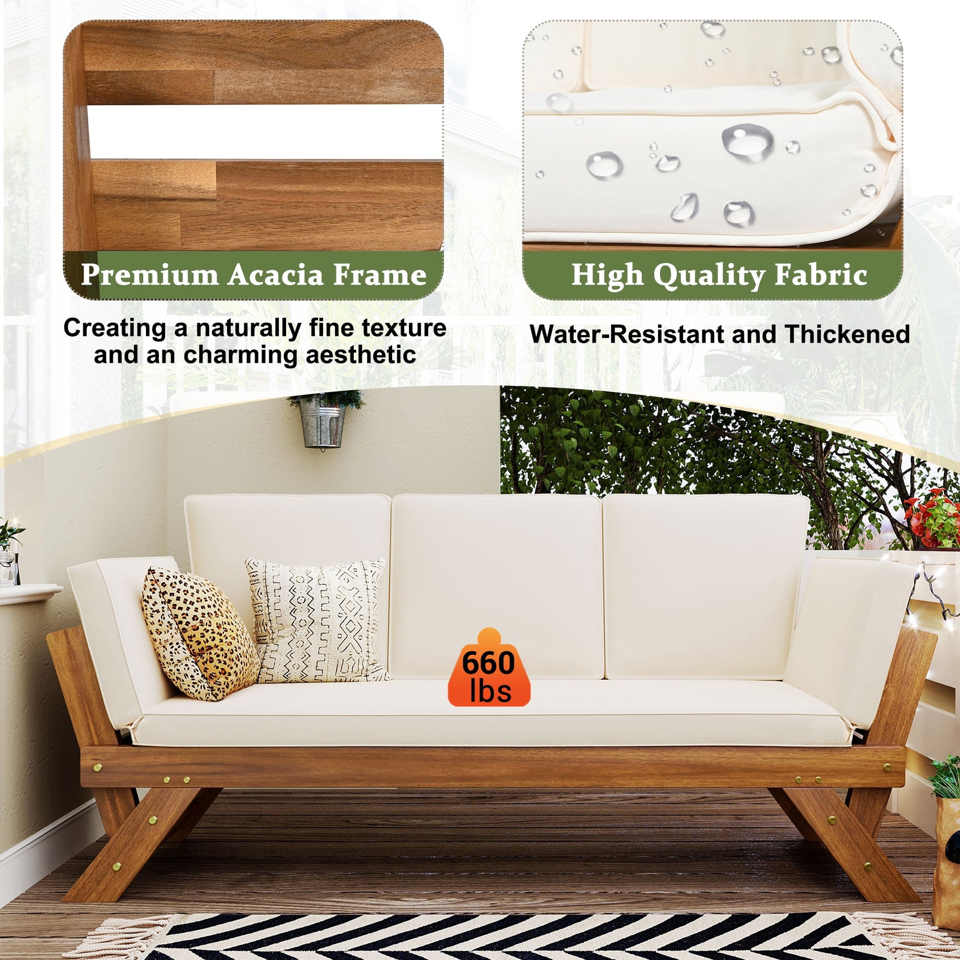 - [Premium Hardwood Frame] This outdoor patio daybed is crafted with acacia wood, which is creating a naturally fine texture and an charming aesthetic. With this material, the set is designed for longevity because the wood is durable, sturdy and withstands climatic variations well. This strong resistance and natural durability make it perfect for outdoor products like out patio daybed.