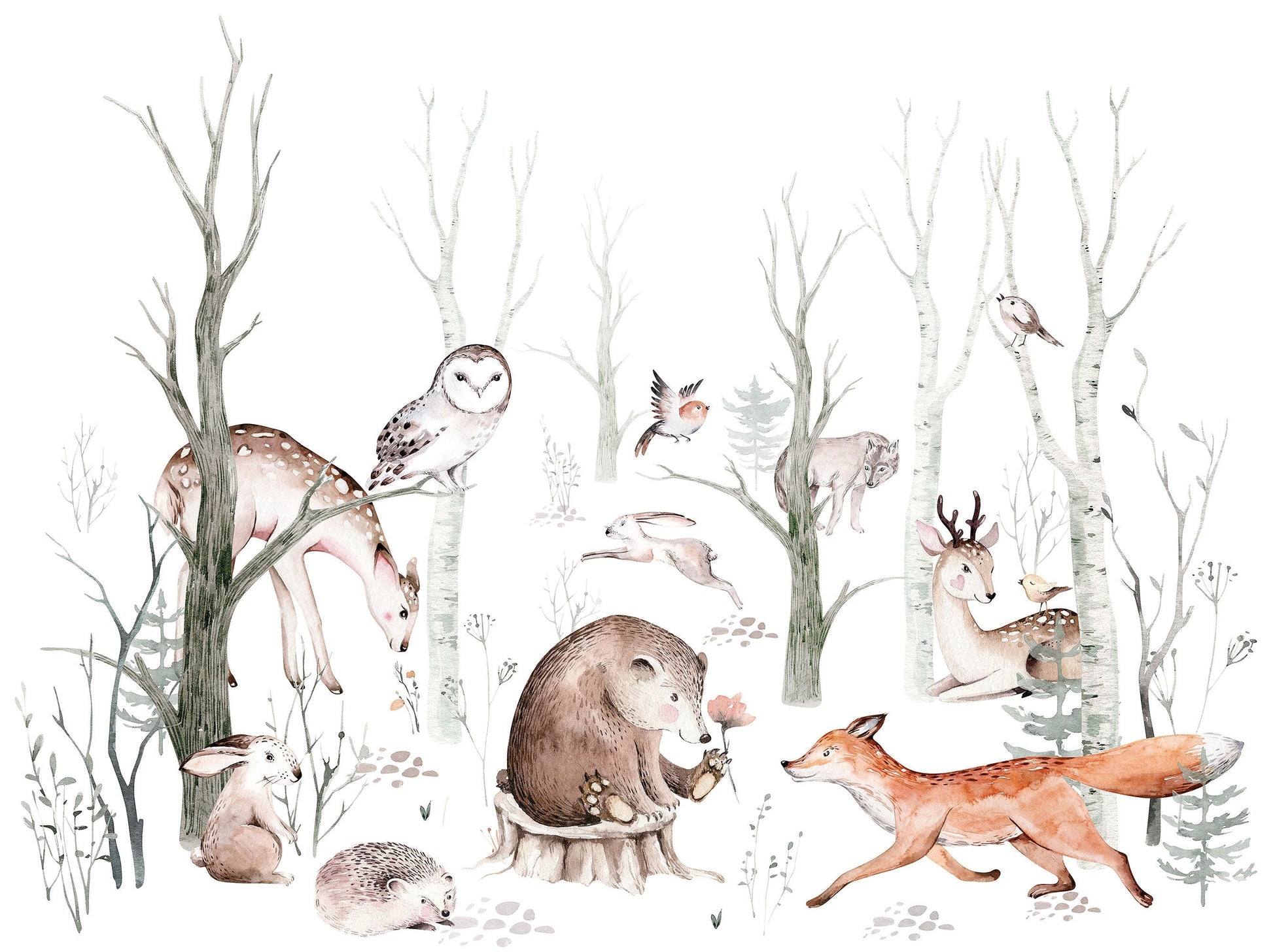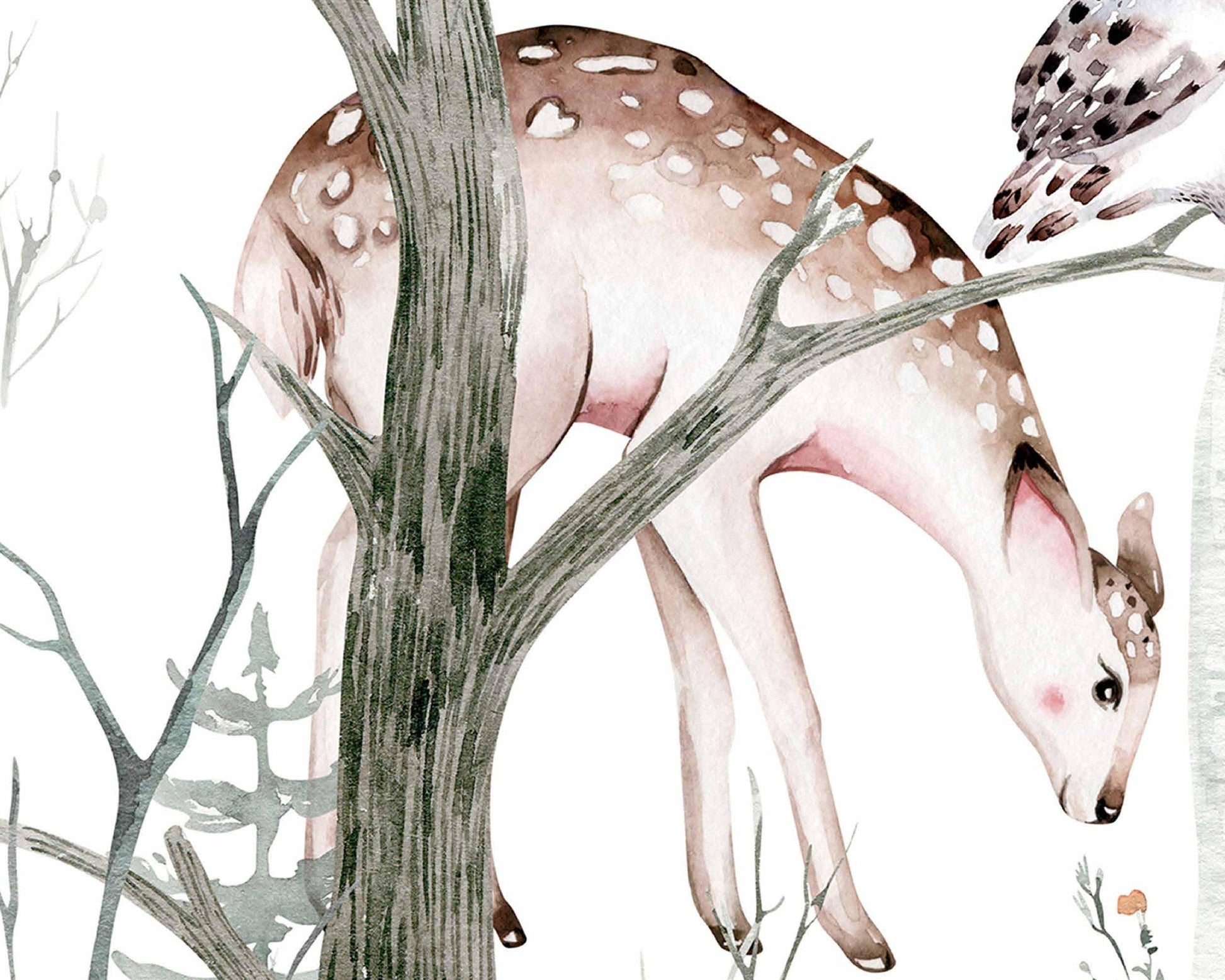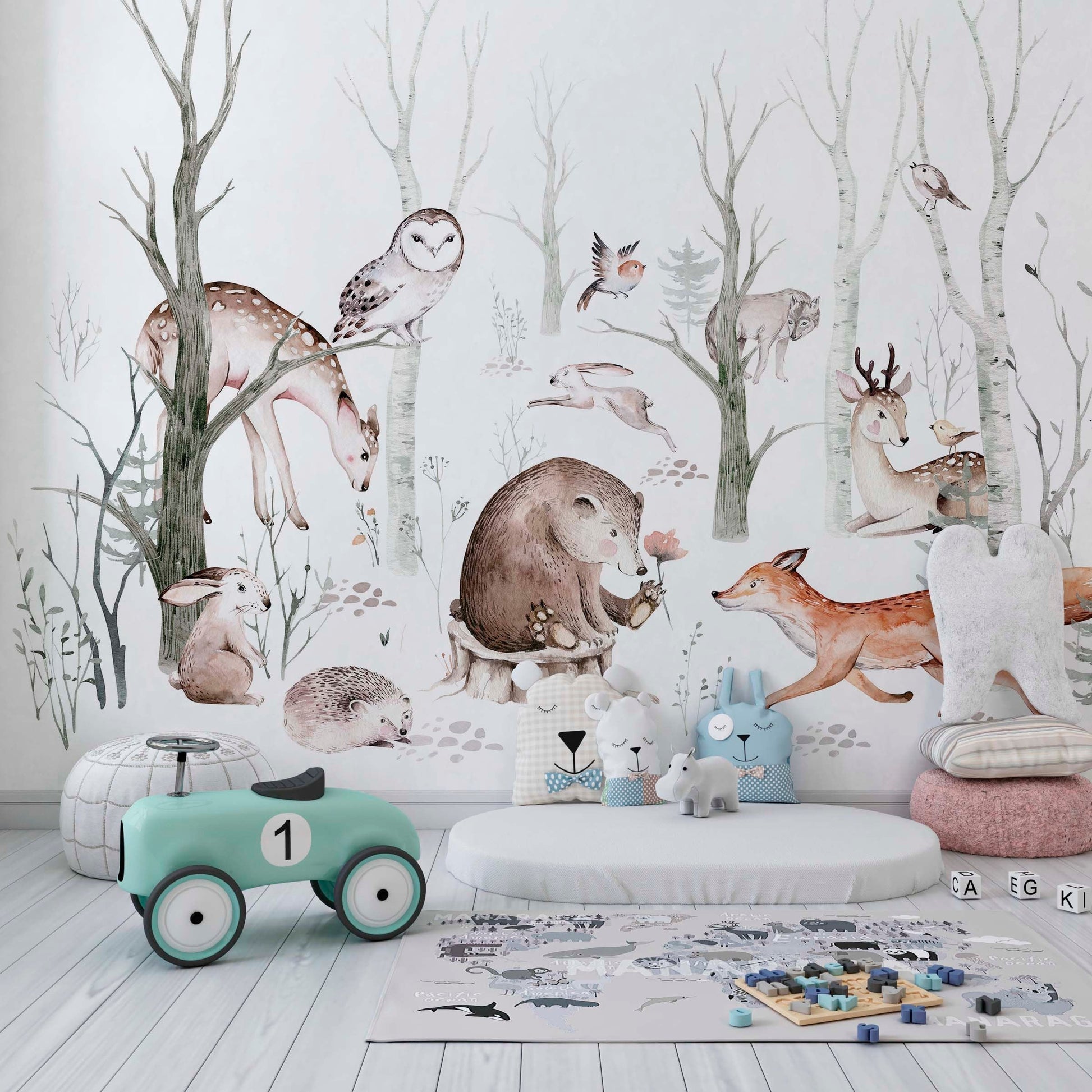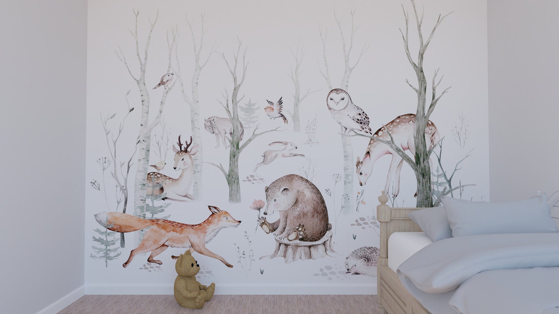 Elevate your nursery or kids' bedroom decor with our beautiful Woodland Forest Animals Wallpaper. This gender-neutral designer wallpaper by Olively is a work of art that can be shipped worldwide. Whether you have a baby boy or girl, this wallpaper will transform their room into a charming and serene forest haven."